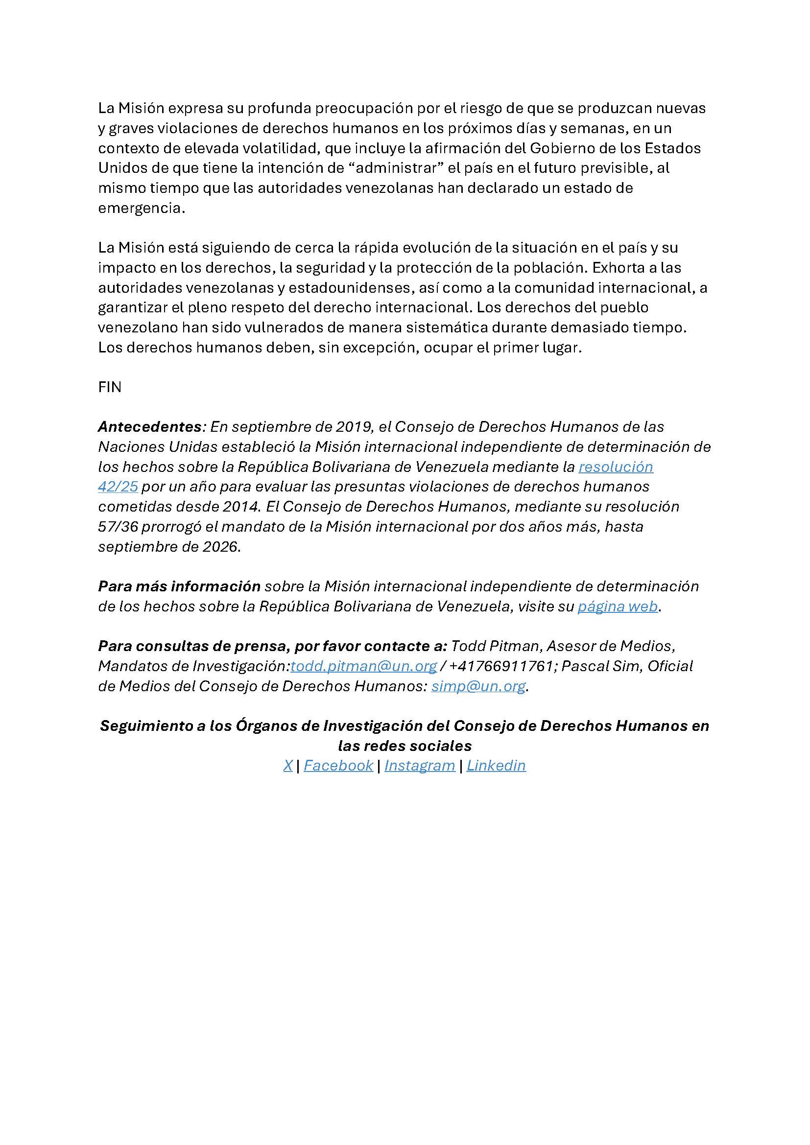 La Misión Internacional Independiente de Determinación de Hechos para Venezuela subrayó la necesidad de garantizar la rendición de cuentas por las graves violaciones de derechos humanos cometidas por el régimen venezolano en el contexto de crisis derivado de la intervención de Estados Unidos y la captura de Nicolás Maduro. El grupo experto sostuvo que es fundamental mantener el foco en las graves violaciones de derechos y crímenes de lesa humanidad cometidos en los años recientes, entre los cuales se encuentran ejecuciones extrajudiciales y otras privaciones arbitrarias de la vida, detenciones arbitrarias, desapariciones forzadas (por lo general, de corta duración), tortura, tratos crueles, inhumanos y degradantes, violencia sexual y violencia de género.